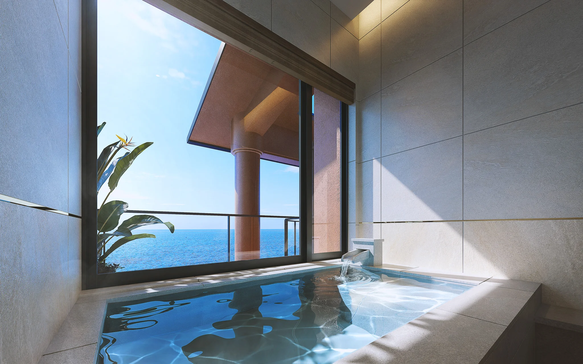 海を一望できる開放的なバスルーム。波音を聴きながら、ゆったりと湯船に浸かる至福のひとときをお愉しみいただけます。
